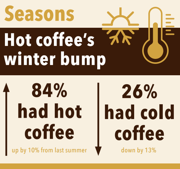 Other changes in the Spring 2023 NCDT can be attributed to seasonal swings. Unsurprisingly, colder temperatures when polling was conducted in January 2023 resulted in some warmer cups – 84% of past-day coffee drinkers had a hot coffee, up 10% from polling in July 2022 (published in October).